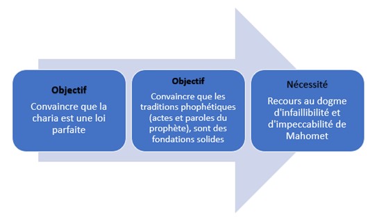 L’objectif est de rendre crédible aux yeux des musulmans, le principe de perfection de la charia. Pour ce faire, il s’agit de convaincre que la charia repose sur des fondations solides.