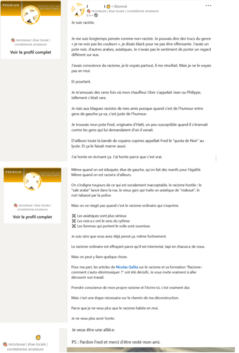 « Pour ma part, les articles de XXX sur le racisme et sa formation racisme comment s’autodesinstoxiquer, ont été décisifs. Je vous invite vraiment à aller y découvrir son travail. »