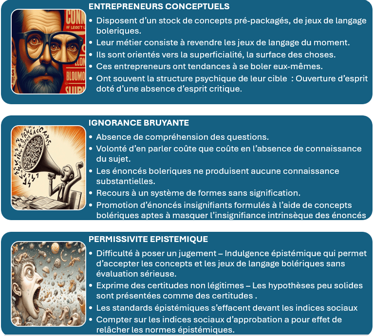 Trois éléments centraux caractérisent le bolerisme : Des acteurs : les entrepreneurs conceptuels, une ignorance bruyante, et une permissivité épistémique.