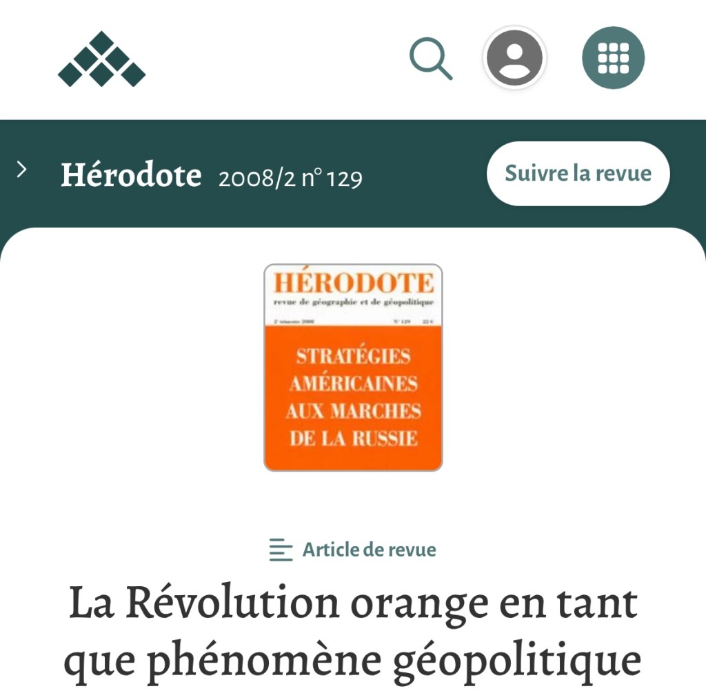 Viatcheslav Avioutskii, in his article “The Orange Revolution as a Geopolitical Phenomenon,” Hérodote, vol. 129, no. 2, 2008, pp. 69-99, writes the following about the so-called “Orange Revolution” of 2004: