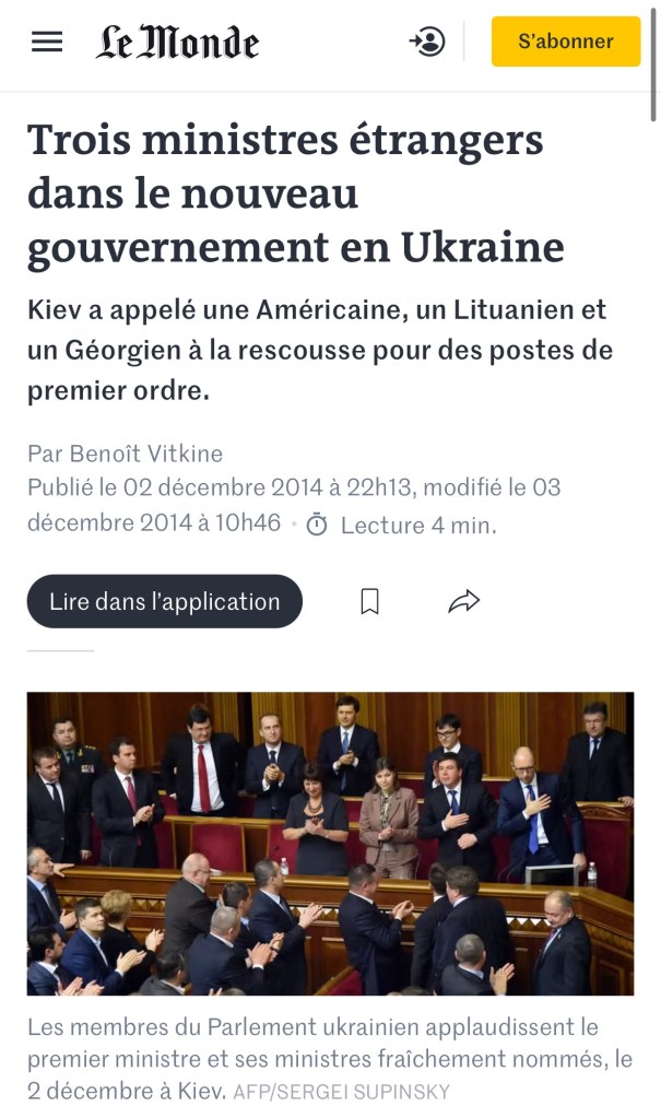 Le Monde continues : « These three explosive entries are an initiative of President Poroshenko, who has reserved for « foreigners », as the Ukrainian press already calls them, a part of the positions that belonged to his party.