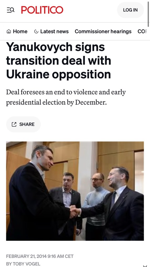 As Politico reported in a February 21, 2014 article, » Ukrainian President Viktor Yanukovych and the three main opposition leaders signed an agreement brokered by the European Union and Russia to end the violence and prepare for a political transition . »