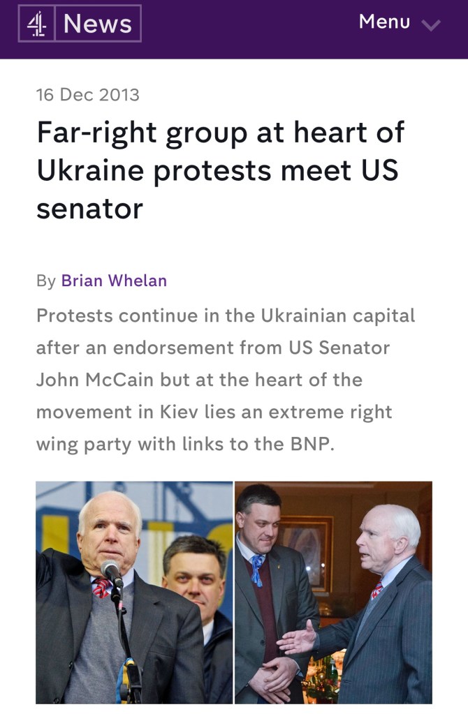 Senator McCain was also questioned at the end of 2013 by journalists after being photographed in the company of this ultra-nationalist, who wanted ethnicity to be required on passports, and who spoke of « Muscovites, Germans, kikes ( a pejorative term for Jews), and other scum who want to take over the Ukrainian nation. »