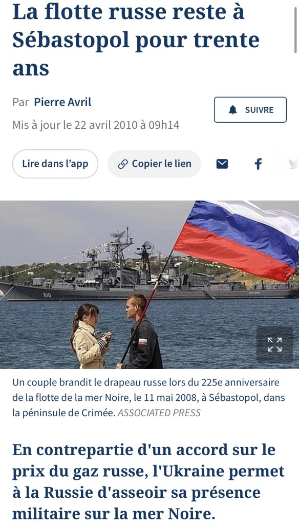 On April 21, 2010, the newspaper « Le Figaro » reported that « in return for an agreement on the price of Russian gas, Ukraine is allowing Russia to establish its military presence on the Black Sea. »
